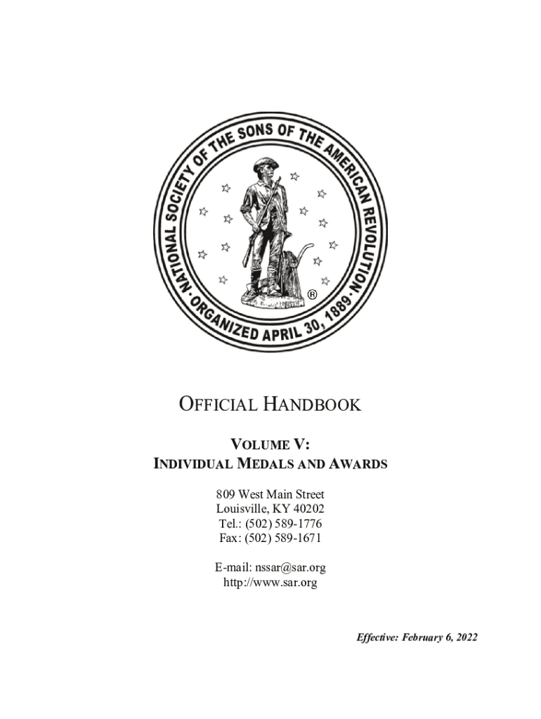 OFFICIAL HANDBOOK VOLUME V: INDIVIDUAL MEDALS AND AWARDS 809 West Main Street Louisville, KY 40202 Tel.: (502) 5891776 Fax: (502) 5891671 Email: nssar@sar.org http://www.sar.orgEffective: February