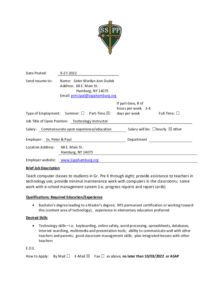 Email: principal@sspphamburg.orgType of Employment:Summer: Job Title of Open Position: