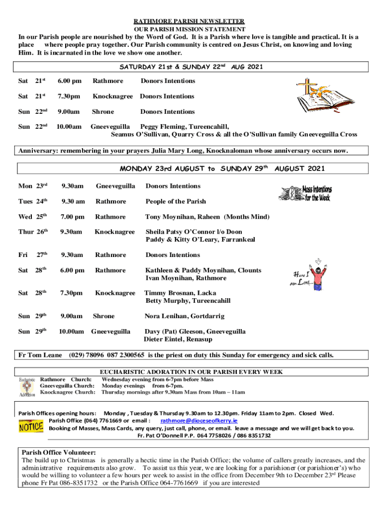 RUSHMORE PARISH NEWSLETTER OUR PARISH MISSION Statementing our Parish people are nourished by the Word of God. It is a Parish where love is tangible and practical. It is a place where people pray