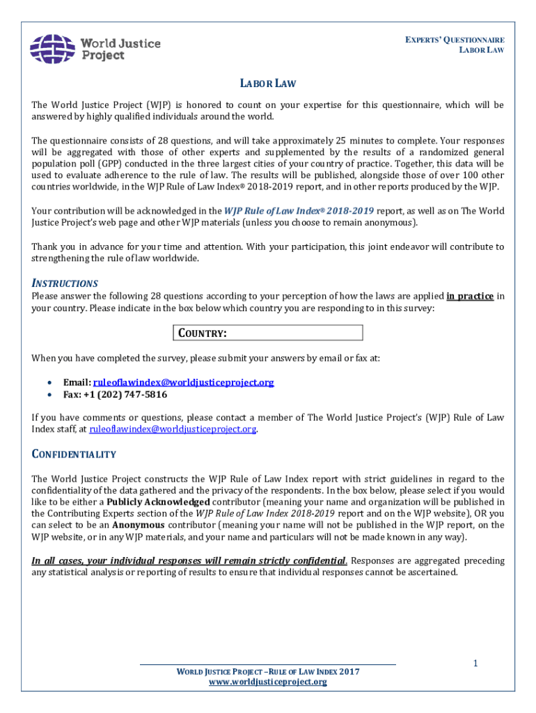 EXPERTS QUESTIONNAIRE LABOR LAW The World Justice Project (JP) is honored to count on your expertise for this questionnaire, which will be answered by highly qualified individuals around the world.