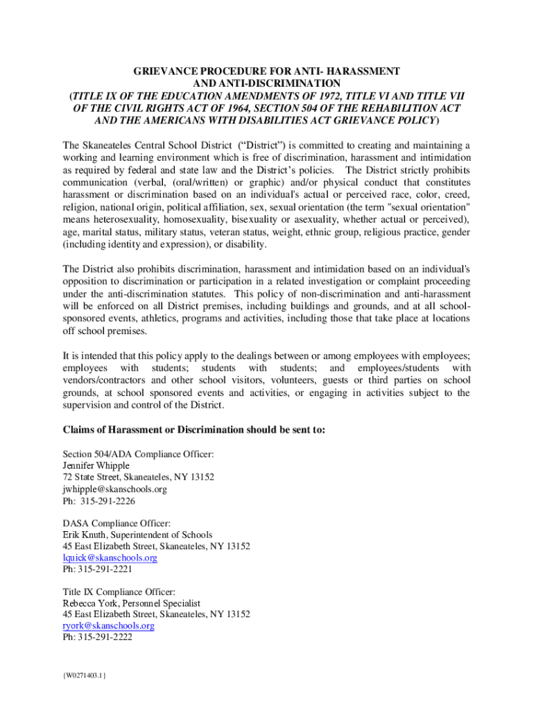 GRIEVANCE PROCEDURE FOR ANTI HARASSMENT AND NONDISCRIMINATION (TITLE IX OF THE EDUCATION AMENDMENTS OF 1972, TITLE VI AND TITLE VII OF THE CIVIL RIGHTS ACT OF 1964, SECTION 504 OF THE REHABILITATION