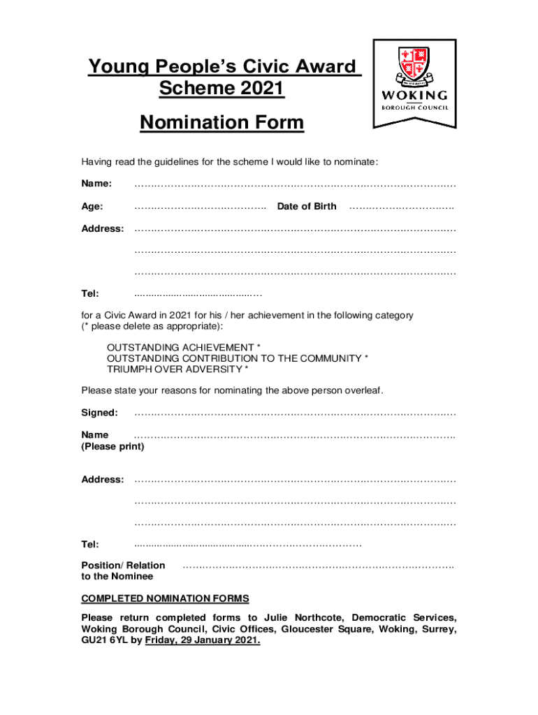 Young Peoples Civic Award Scheme 2021 Nomination Form Having read the guidelines for the scheme I would like to nominate: Name:. Age:. Address:. Date of Birth.