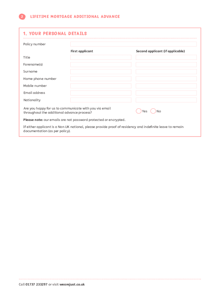 Lifetime Mortgage Additional AdvanceApplication format this application form This is an application form for an additional advance for your existing lifetime mortgage. To avoid delays in processing,
