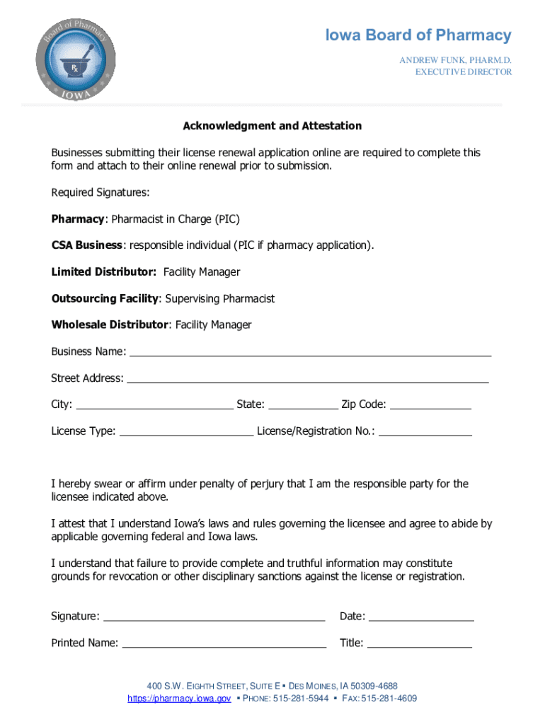 Iowa Board of Pharmacy ANDREW FUNK, HARM. D. EXECUTIVE DIRECTORAcknowledgment and Attestation Businesses submitting their license renewal application online are required to complete this form and