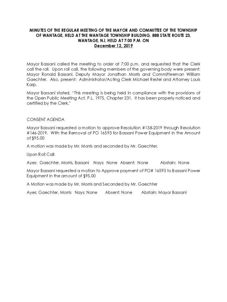 MINUTES OF THE REGULAR MEETING OF THE MAYOR AND COMMITTEE OF THE TOWNSHIP VANTAGE, HELD AT THE VANTAGE TOWNSHIP BUILDING, 888 STATE ROUTE 23,VANTAGE, NJ, HELD AT 7:00 P.M. ON December 12, 2019Mayor