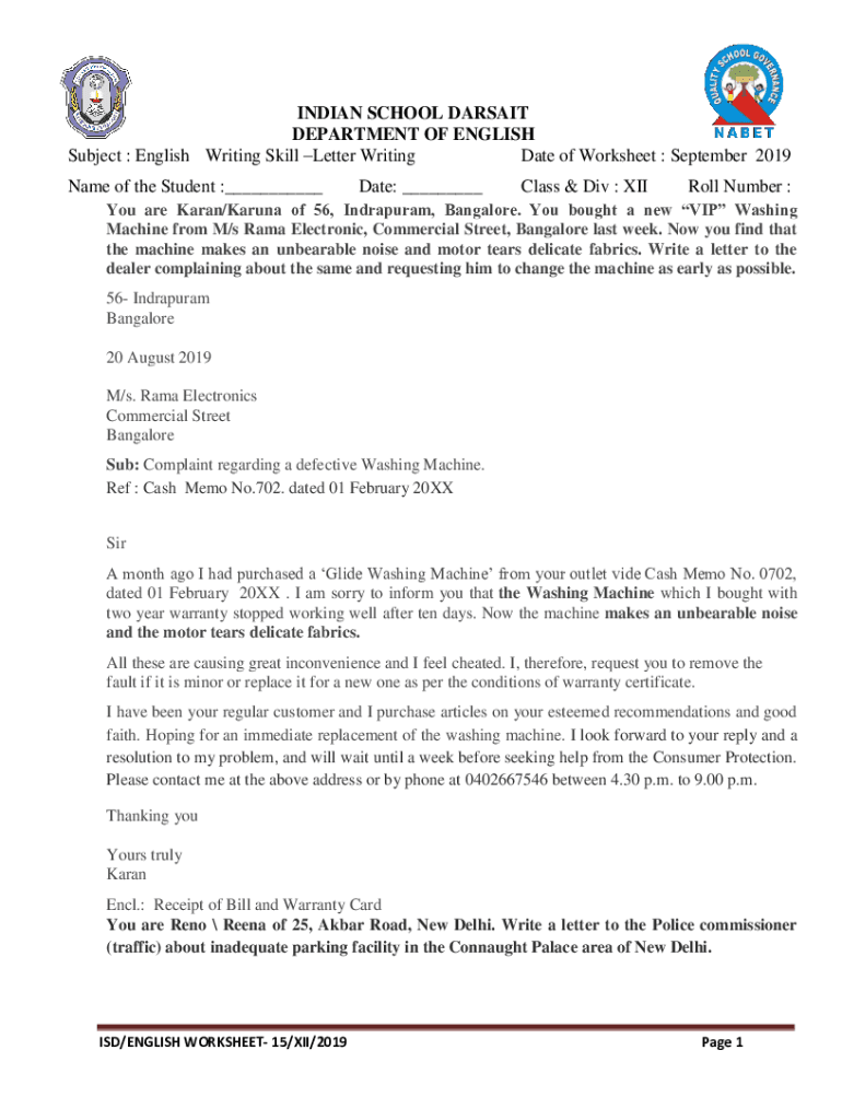 INDIAN SCHOOL PARFAIT DEPARTMENT OF ENGLISH Subject : English Writing Skill Letter Writing Date of Worksheet : September 2019 Name of the Student :___Date: ___Class & Div : Roll Number :You are Karen/Karina