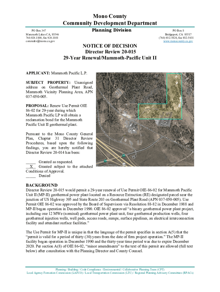 Mono County Community Development Department PO Box 347 Mammoth Lakes CA, 93546 760.924.1800, fax 924.1801 commdev@mono.ca.govPlanning DivisionNOTICE OF DECISION Director Review 20015 29Year Renewal/Mammoth
