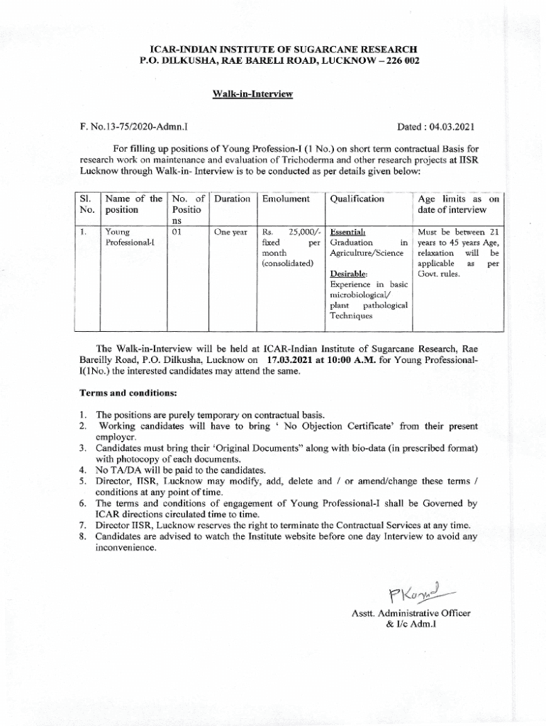 AMERINDIAN INSTITUTE OF SUGARCANE RESEARCH P.O. DILKUSHA, RAE BARELY ROAD, LUCKNOW 226 002WalkinInterviewF. No. 1375/2020Admn. Dated: 04.03 .2021For filling up positions of Young Profession (1 No.)