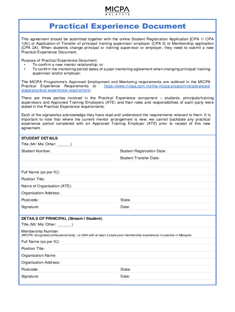 Practical Experience Document This agreement should be submitted together with the online Student Registration Application [CPA 1/ CPA 1(A)) or Application of Transfer of principal/ training supervisor/