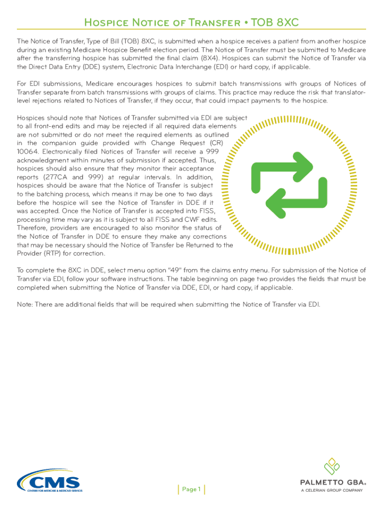 Hospice Notice of Transfer TOB 8XC The Notice of Transfer, Type of Bill (TOB) 8XC, is submitted when a hospice receives a patient from another hospice during an existing Medicare Hospice Benefit election