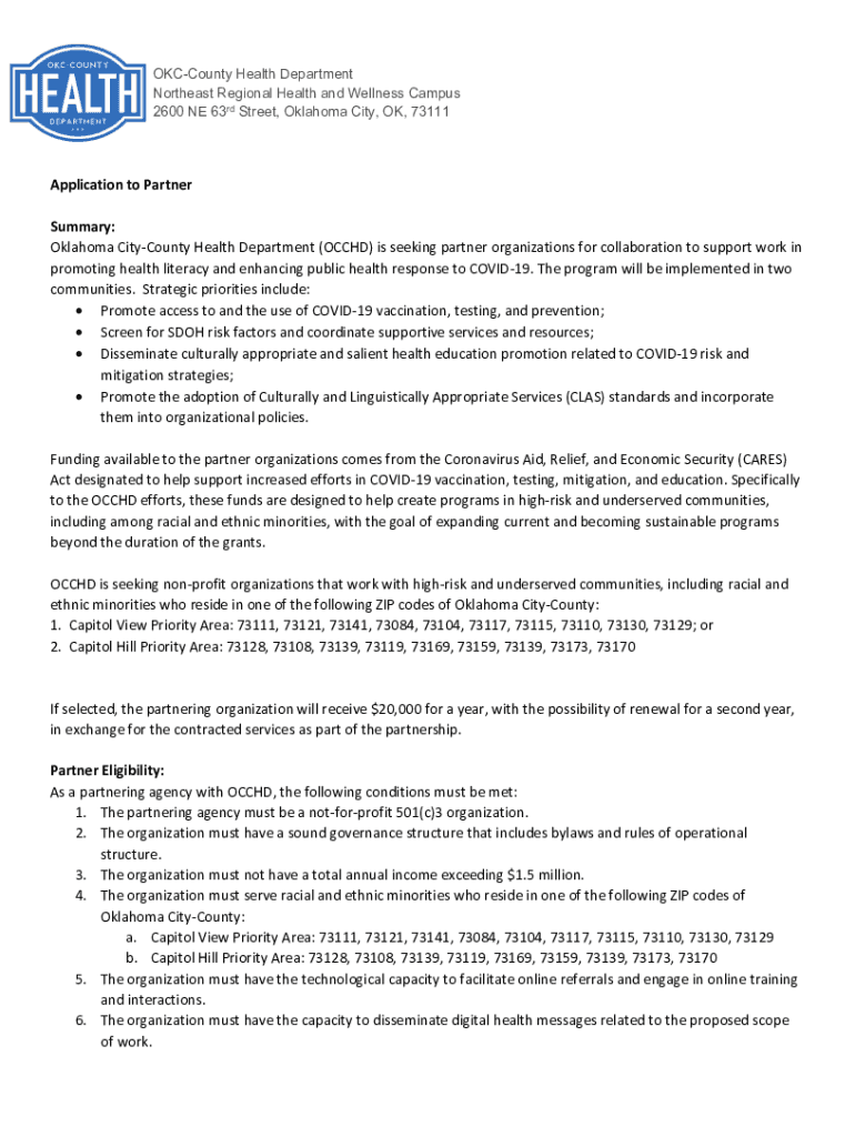 Account Health Department Northeast Regional Health and Wellness Campus 2600 NE 63rd Street, Oklahoma City, OK, 73111Application to Partner Summary: Oklahoma CityCounty Health Department (OCC HD)