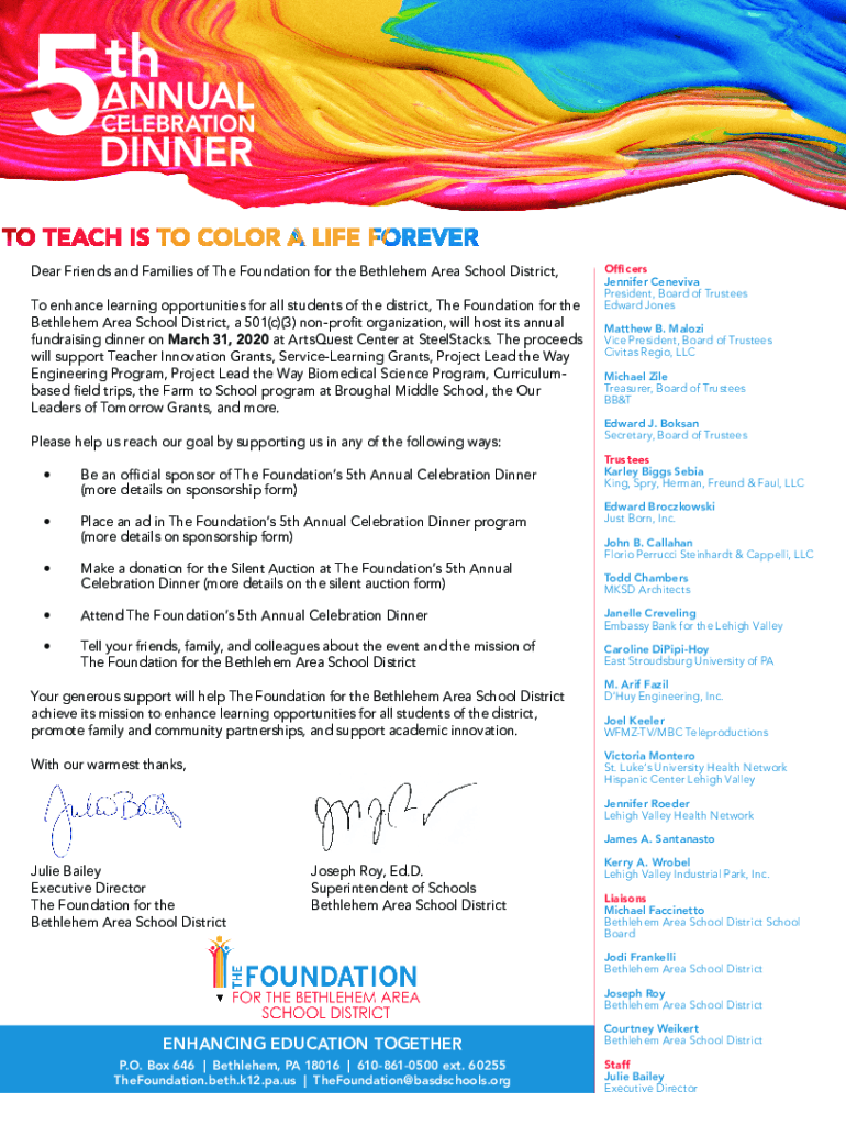 Dear Friends and Families of The Foundation for the Bethlehem Area School District, To enhance learning opportunities for all students of the district, The Foundation for the Bethlehem Area School