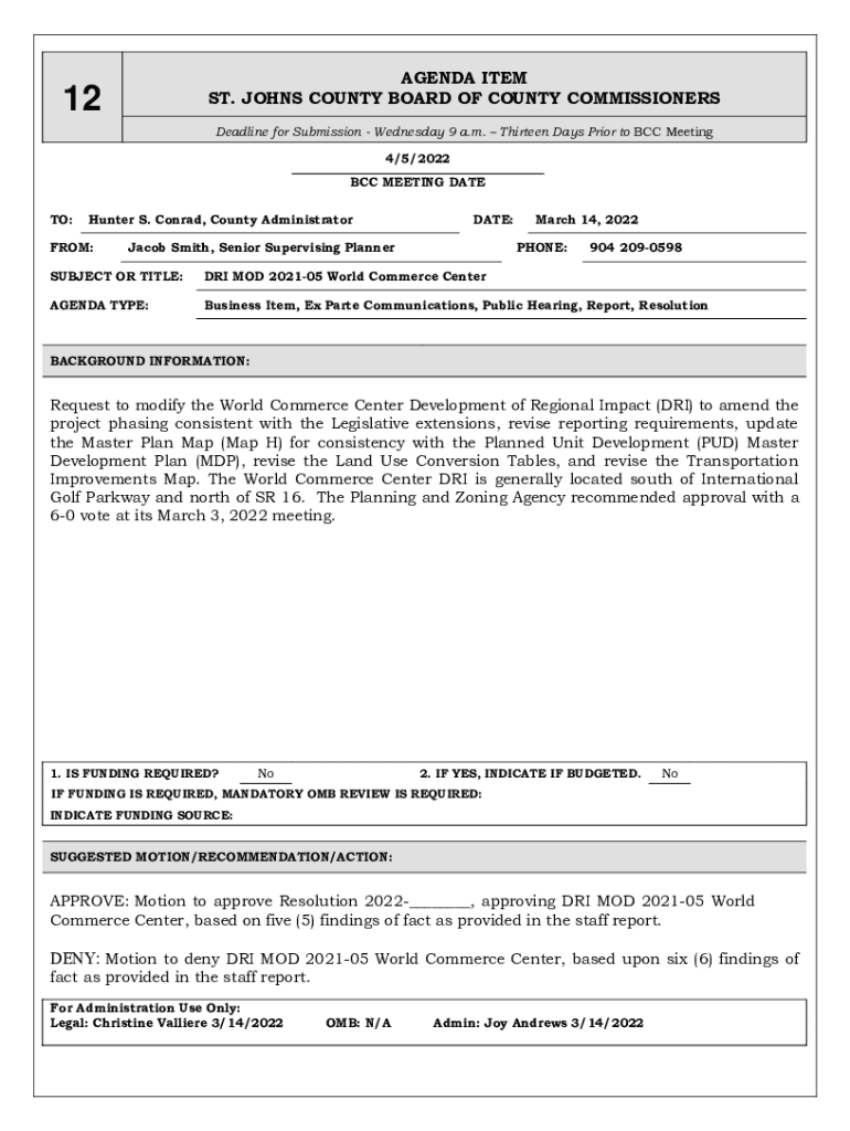 ST. JOHNS COUNTY BOARD OF COUNTY COMMISSIONERS12Deadline for Submission Wednesday 9 a.m. Thirteen Days Prior to BCC Meeting