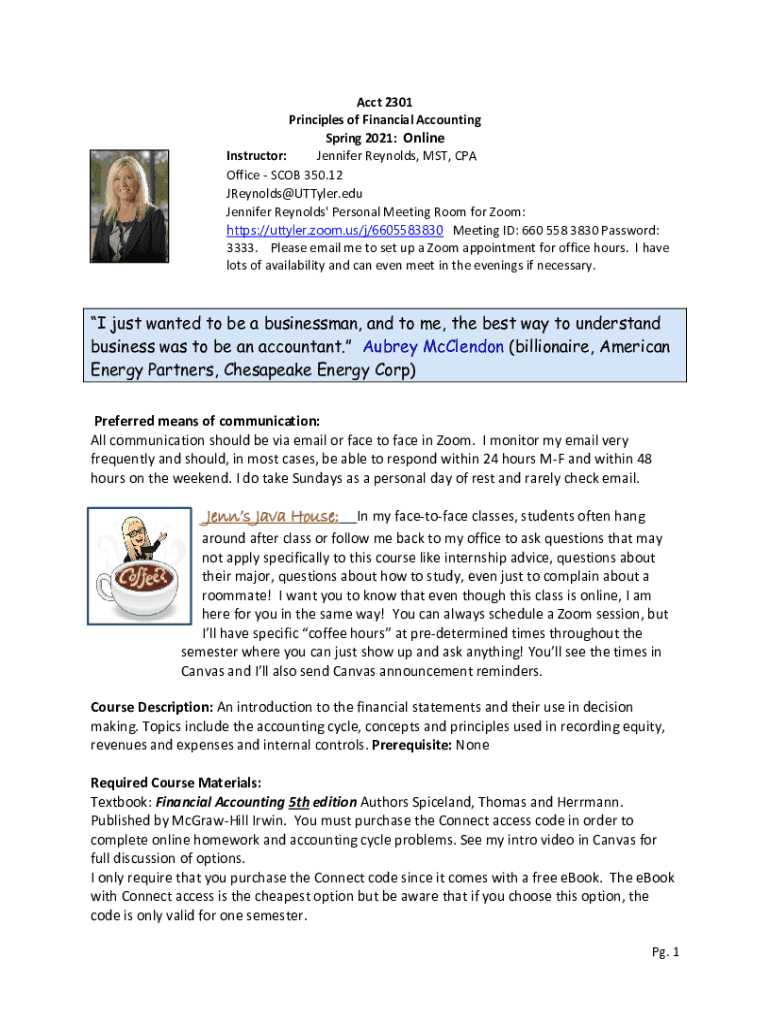 Acct 2301 Principles of Financial Accounting Spring 2021: Online Instructor: Jennifer Reynolds, MST, CPA Office SCOT 350.12 JReynolds@UTTyler.edu Jennifer Reynolds\' Personal Meeting Room for Zoom: