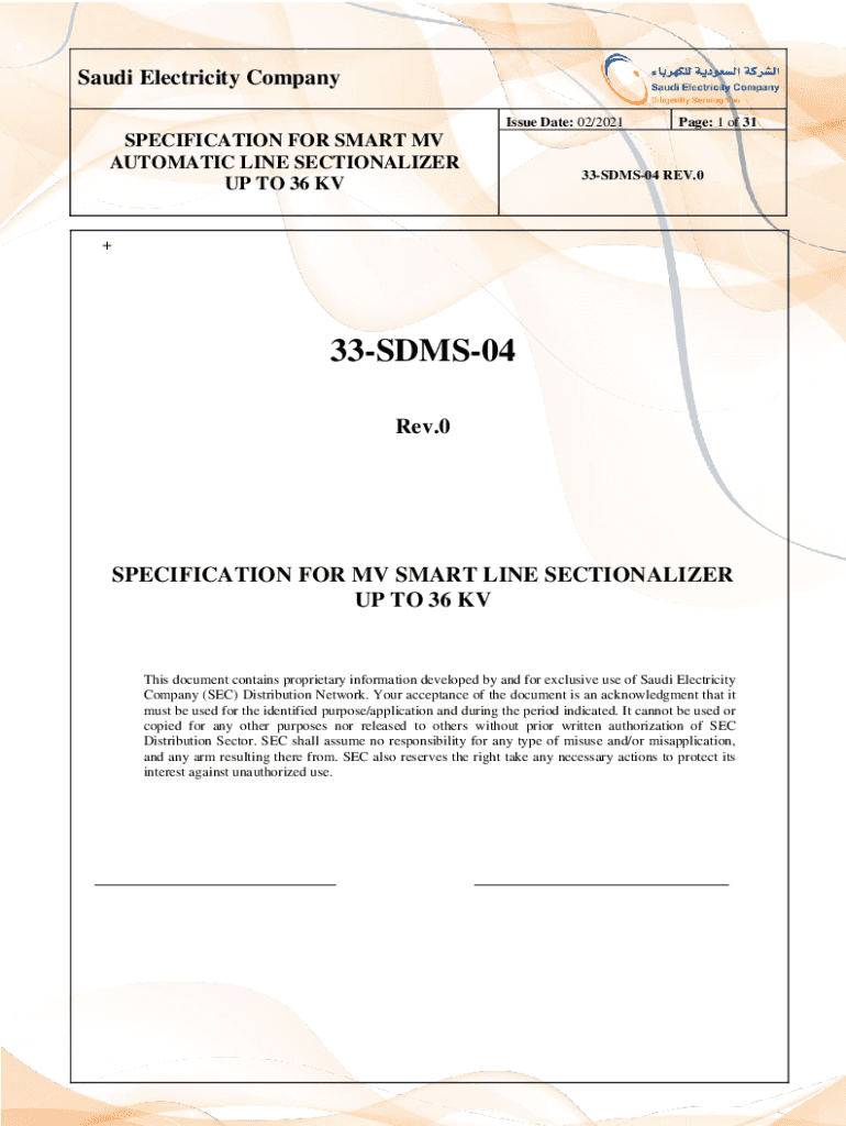 Saudi Electricity Company Issue Date: 02/2021SPECIFICATION FOR SMART MV AUTOMATIC LINE SECTIONALIZE UP TO 36 KV Page: 1 of 3133SDMS04 REV.0+33SDMS04 Rev.0SPECIFICATION FOR MV SMART LINE SECTIONALIZE