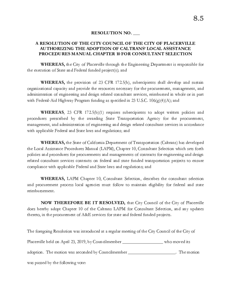 8.5 RESOLUTION NO. ___ A RESOLUTION OF THE CITY COUNCIL OF THE CITY OF PORTERVILLE AUTHORIZING THE ADOPTION OF COLTRANE LOCAL ASSISTANCE PROCEDURES MANUAL CHAPTER 10 FOR CONSULTANT SELECTION WHEREAS,