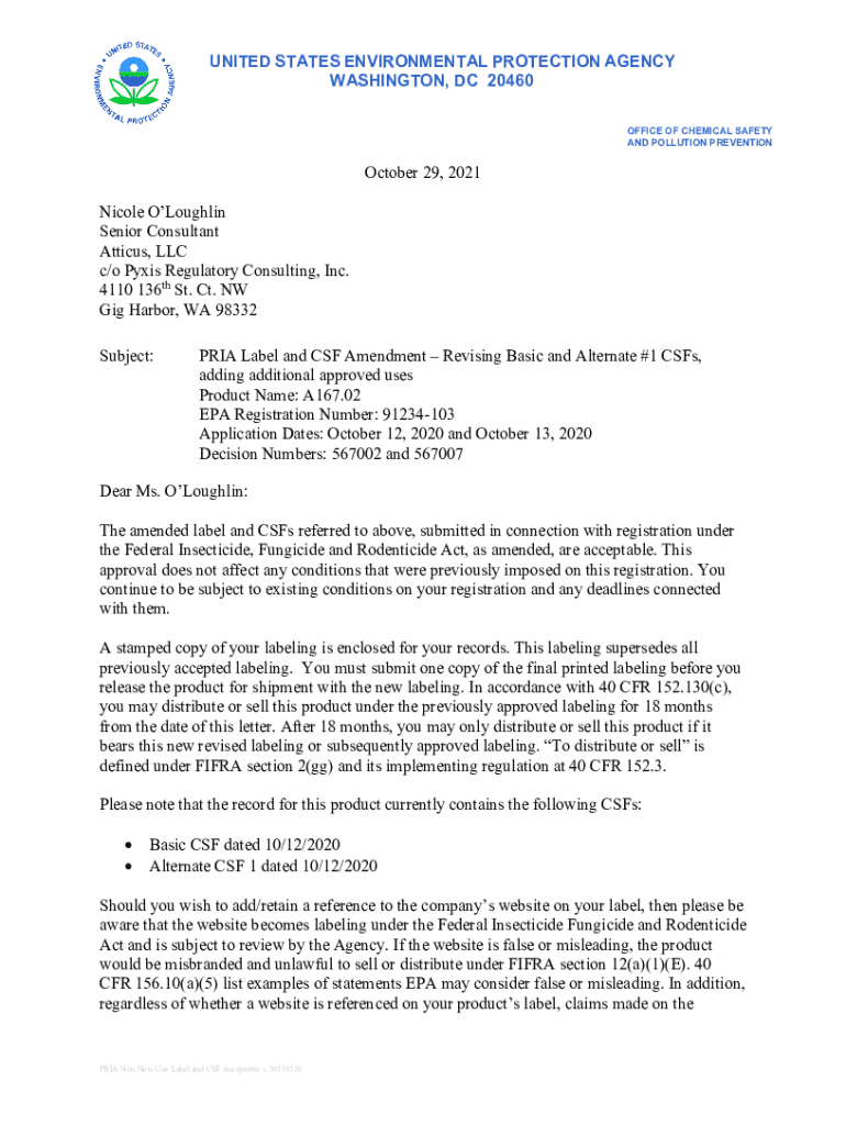 UNITED STATES ENVIRONMENTAL PROTECTION AGENCY WASHINGTON, DC 20460 OFFICE OF CHEMICAL SAFETY AND POLLUTION PREVENTION October 29, 2021, Nicole Loughlin Senior Consultant Atticus, LLC c/o Pyxes Regulatory