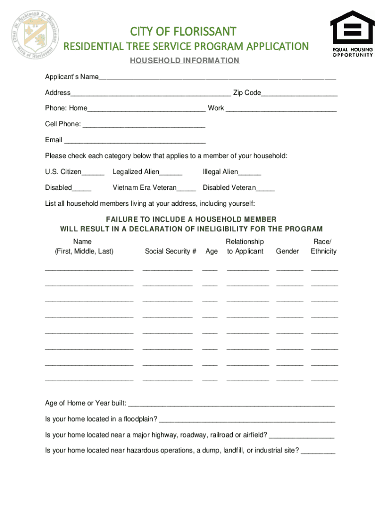 CITY OF FLORISSANT RESIDENTIAL TREE SERVICE PROGRAM APPLICATION HOUSEHOLD INFORMATION Applicants Name___ Address___ Zip Code___ Phone: Home___ Work ___ Cell Phone: ___ Email ___ Please check each