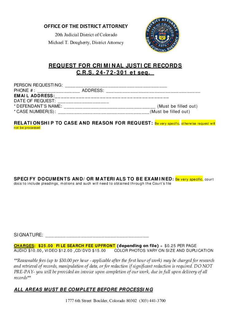 OFFICE OF THE DISTRICT ATTORNEY 20th Judicial District of Colorado Michael T. Dougherty, District AttorneyREQUEST FOR CRIMINAL JUSTICE RECORDS C.R.S. 2472301 et seq. PERSON REQUESTING: ___ PHONE #: