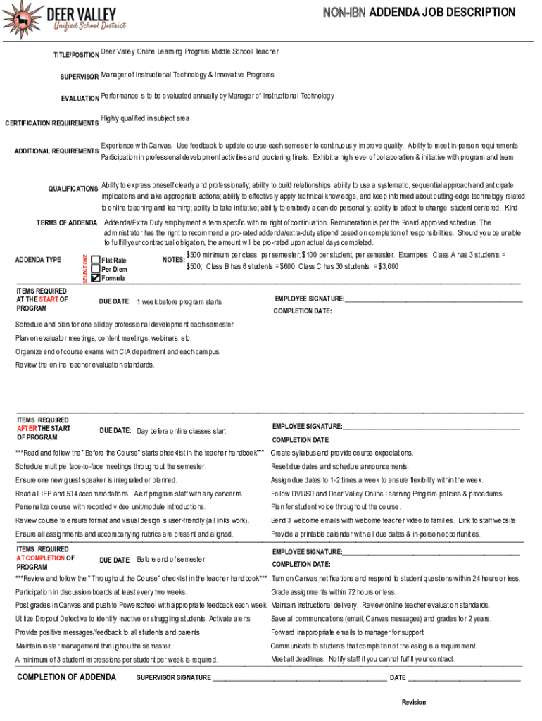 NOTION ADDENDA JOB DESCRIPTION TITLE/POSITION Deer Valley Online Learning Program Middle School Teacher SUPERVISOR Manager of Instructional Technology & Innovative Programs EVALUATION Performance