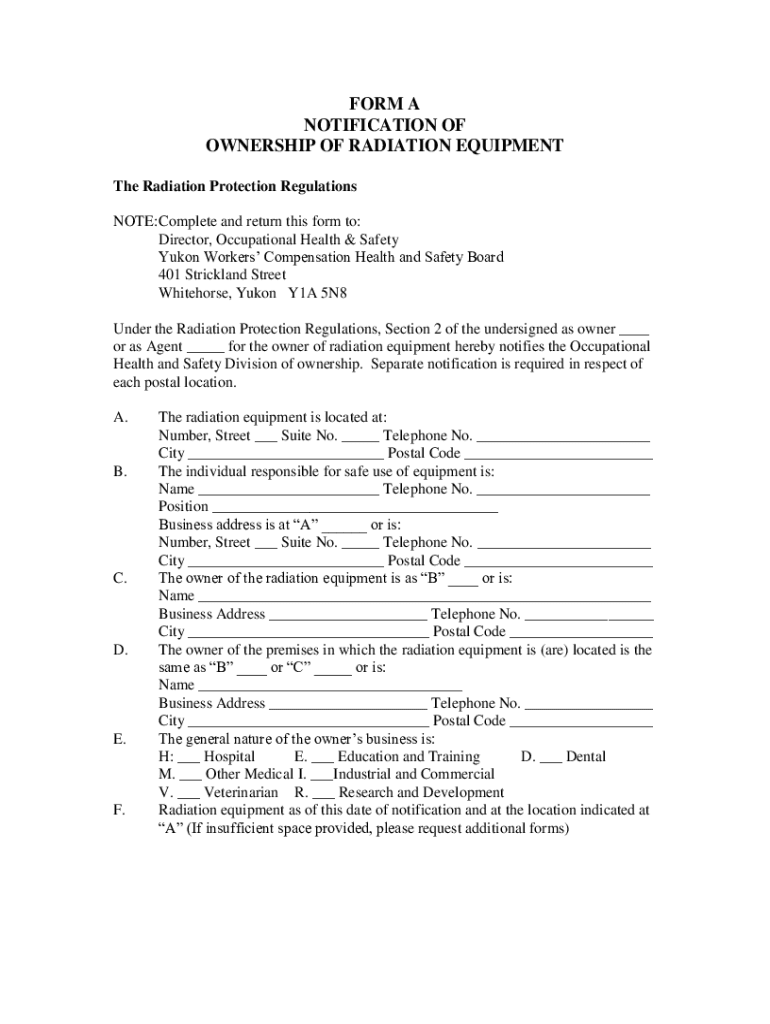 FORM A NOTIFICATION OF OWNERSHIP OF RADIATION EQUIPMENT The Radiation Protection Regulations NOTE: Complete and return this form to: Director, Occupational Health & Safety Yukon Workers Compensation