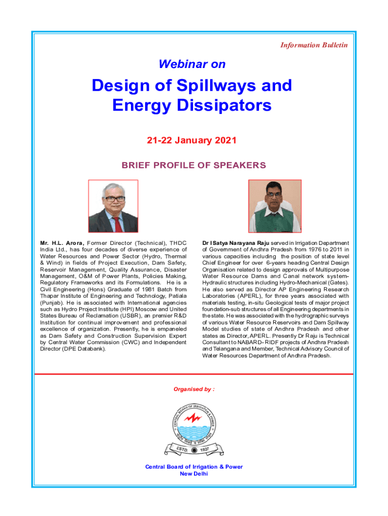 Information BulletinWebinar InDesign of Spillways and Energy Dissipates 2122 January 2021 Brief Profile of Speakers Mr. H.L. Aurora, Former Director (Technical), THC India Ltd., has four decades of