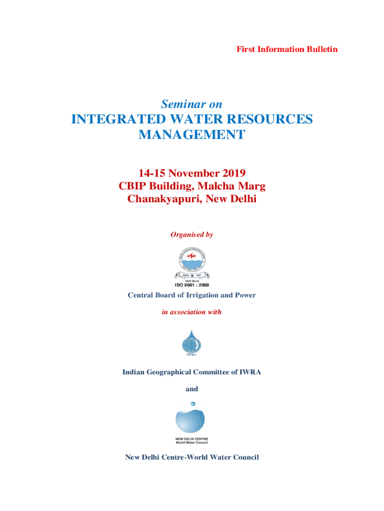 First Information BulletinSeminar integrated WATER RESOURCES MANAGEMENT 1415 November 2019 CBIP Building, Match Mary Chanakyapuri, New Delhi Organized by ISO 9001 : 2008Central Board of Irrigation