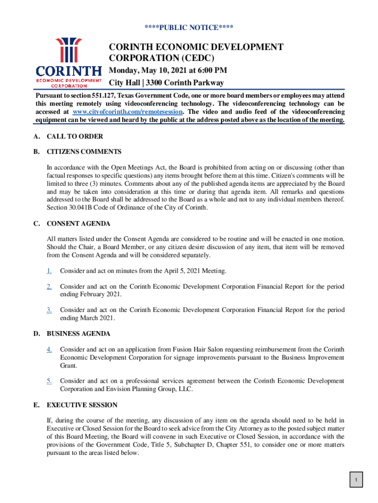 ****PUBLIC NOTICE****CORINTH ECONOMIC DEVELOPMENT CORPORATION (CDC) Monday, May 10, 2021, at 6:00 PM City Hall | 3300 Corinth Parkway Pursuant to section 551.127, Texas Government Code, one or more