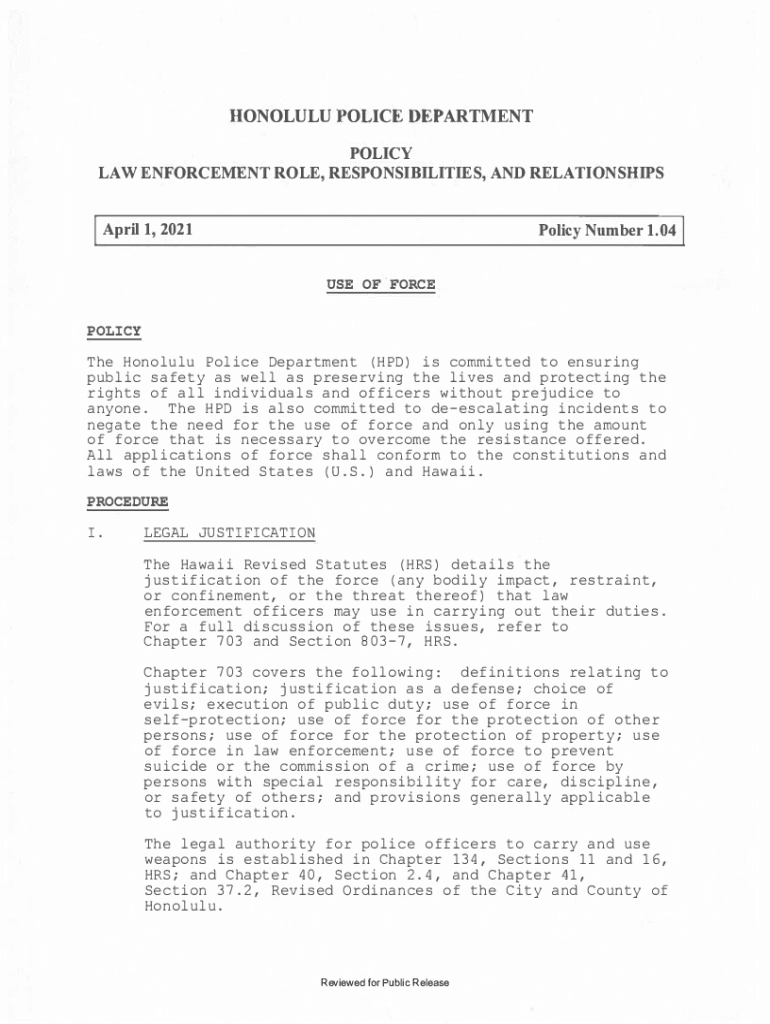 USE OF.FORCEPOLICYThe Honolulu Police Department (HPD) is committed to