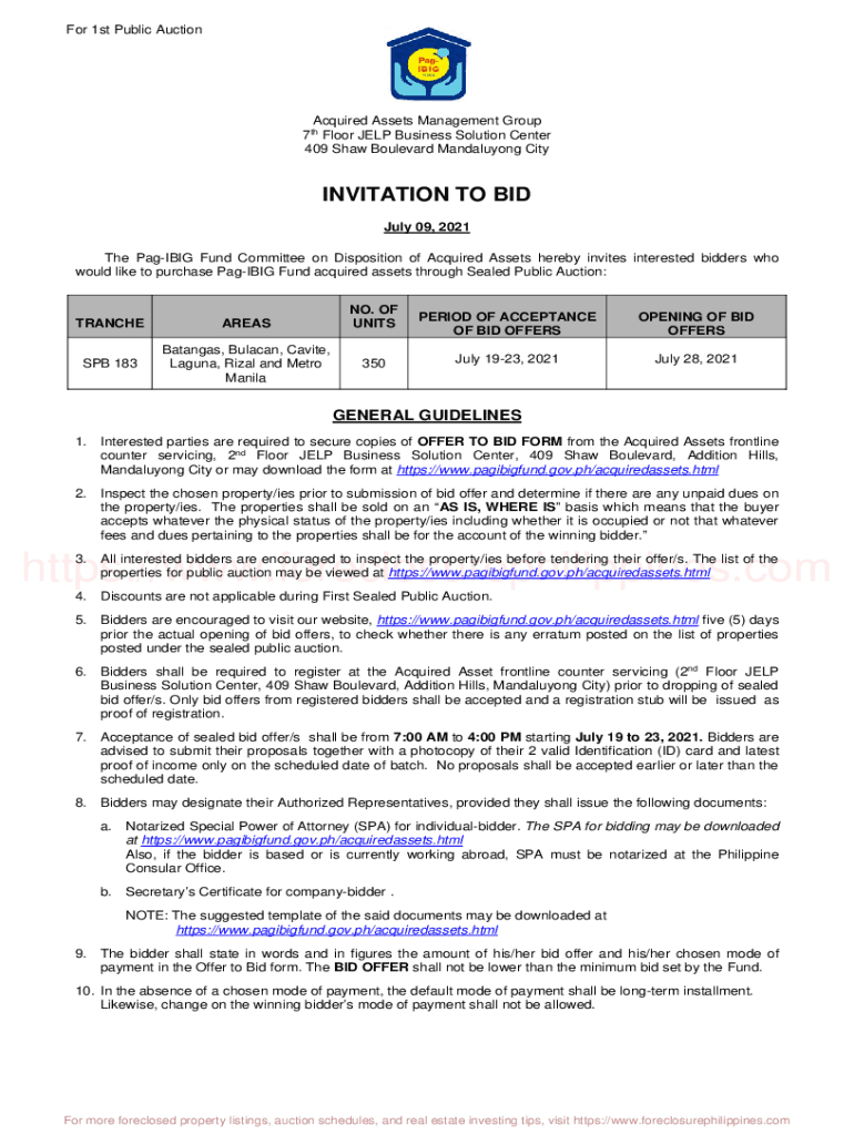 For 1st Public AuctionAcquired Assets Management Group 7th Floor HELP Business Solution Center 409 Shaw Boulevard Mandaluyong CityINVITATION TO BID July 09, 2021, The Paging Fund Committee on Disposition