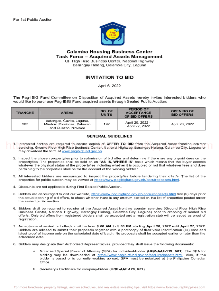 For 1st Public AuctionCalamba Housing Business Center Task Force Acquired Assets Management GF High Rise Business Center, National Highway Barangay Haling, Catawba City, LagunaINVITATION TO BID April