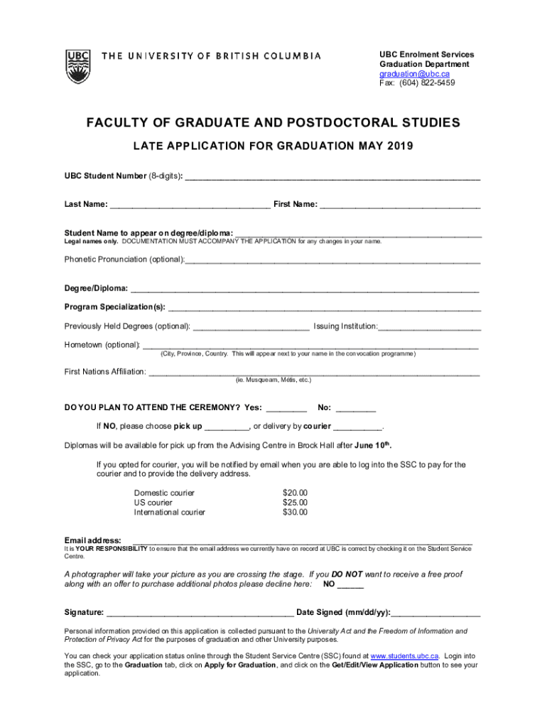 UBC Enrollment Services Graduation Department graduation@ubc.ca Fax: (604) 8225459FACULTY OF GRADUATE AND POSTDOCTORAL STUDIES LATE APPLICATION FOR GRADUATION MAY 2019 UBC Student Number (8digits):