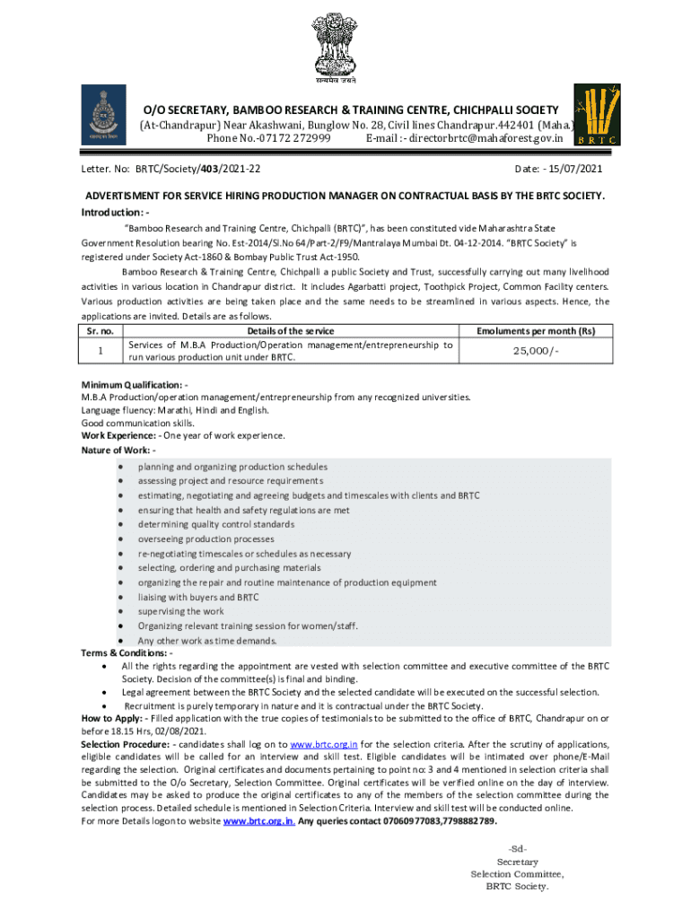 O/O SECRETARY, BAMBOO RESEARCH & TRAINING Center, CHICHPALLI SOCIETY
