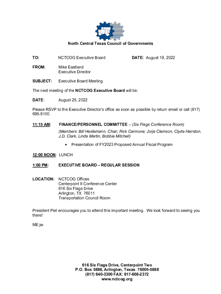North Central Texas Council of Governments TO:ACTION Executive Boardroom:Mike East land Executive DirectorSUBJECT:Executive Board MeetingDATE: August 19, 2022The next meeting of the ACTION Executive