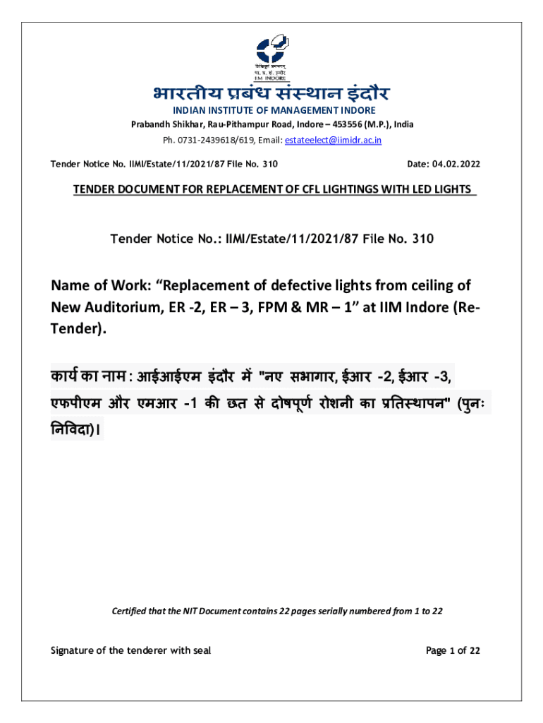 INDIAN INSTITUTE OF MANAGEMENT INDORE Armband Shikhar, RauPithampur Road, Indore 453556 (M.P.), India pH. 07312439618/619, Email: estateelect@iimidr.ac.in Tender Notice No. MIMI/Estate/11/2021/87