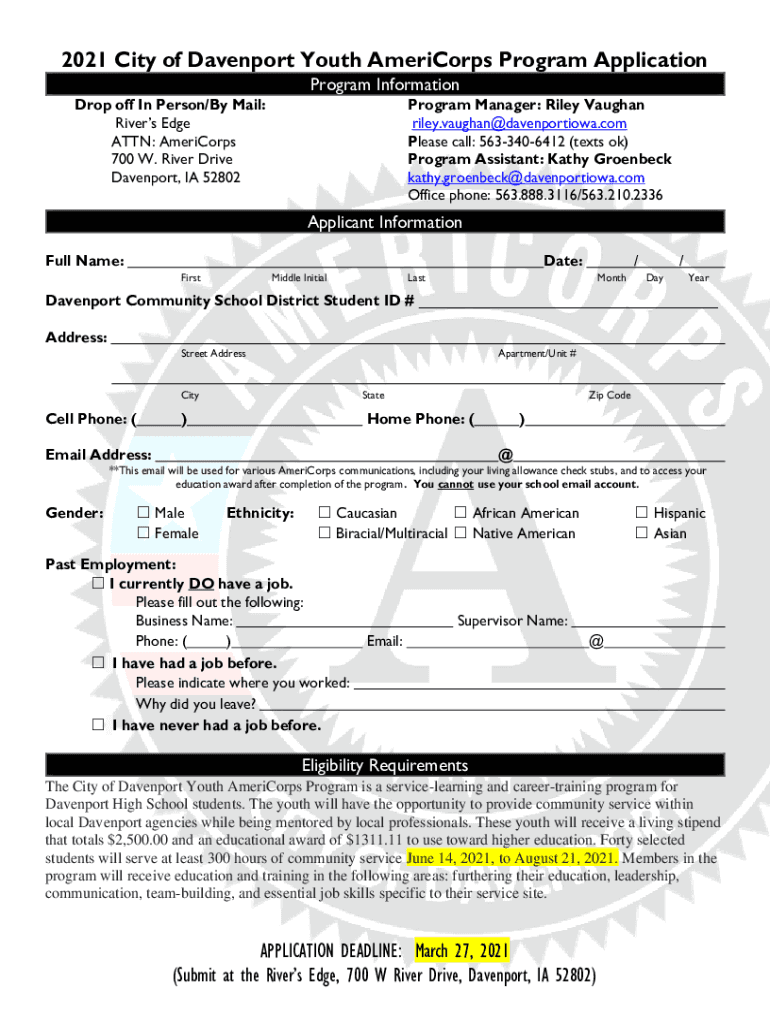 2021 City of Davenport Youth AmeriCorps Program Application