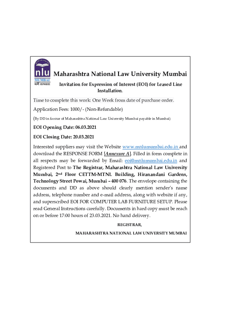 Maharashtra National Law University Mumbai Invitation for Expression of Interest (EOI) for Leased Line Installation. Time to complete this work: One Week from date of purchase order. Application Fees: