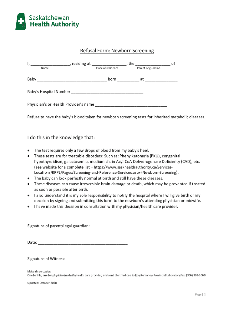 Refusal Form: Newborn Screening I, ___, residing at ___, the ___ of Nameplate of residenceParent or guardianBaby ___ born ___ at ___ Babies Hospital Number ___ Physicians or Health Providers name