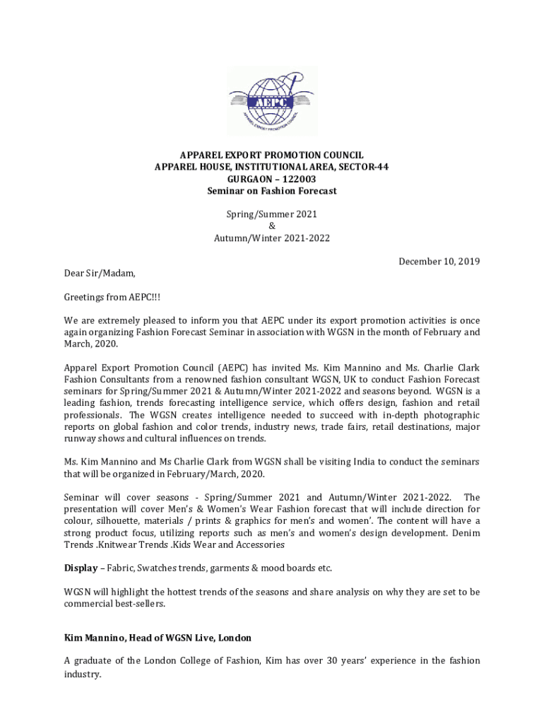 APPAREL EXPORT PROMOTION COUNCIL APPAREL HOUSE, INSTITUTIONAL AREA, SECTOR44 GURGAON 122003 Seminar on Fashion Forecast Spring/Summer 2021 & Autumn/Winter 20212022 December 10, 2019, Dear Sir/Madam,