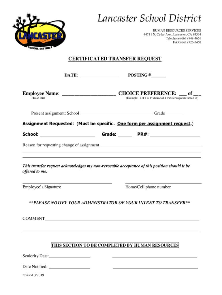 Lancaster School District HUMAN RESOURCES SERVICES 44711 N. Cedar Ave., Lancaster, CA 93534 Telephone (661) 9484661 FAX (661) 7265450CERTIFICATED TRANSFER REQUEST DATE: ___POSTING #___Employee Name:
