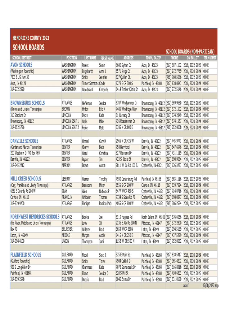 HENDRICKS COUNTY 2023SCHOOL BOARDS SCHOOL DISTRICTSCHOOL BOARDS (NONPARTISAN) POSITIONS NAMEADDRESSFIRST HOMETOWN, IN, ZIPPHONEON ALLOTTED LIMITATION SCHOOLSWASHINGTON WASHINGTON WASHINGTON WASHINGTON