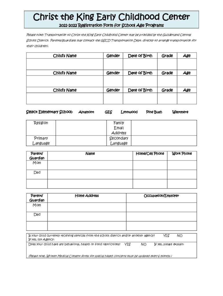 Christ the King Early Childhood Center 20212022 Registration Form for School Age Programs Please note: Transportation to Christ the King Early Childhood Center may be provided by the Guilder land