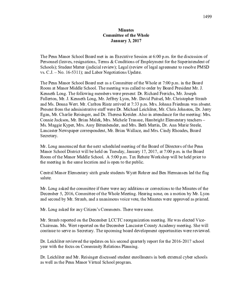 1499 Minutes Committee of the Whole January 3, 2017, The Penn Manor School Board met in an Executive Session at 6:00 p.m. for the discussion of Personnel (leaves, resignations, Terms & Conditions