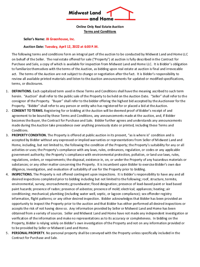 Online Only Real Estate Auction Terms and Conditions Sellers Name: JB Greenhouse, Inc. Auction Date: Tuesday, April 12, 2022, at 6:00 P.M. The following terms and conditions form an integral part