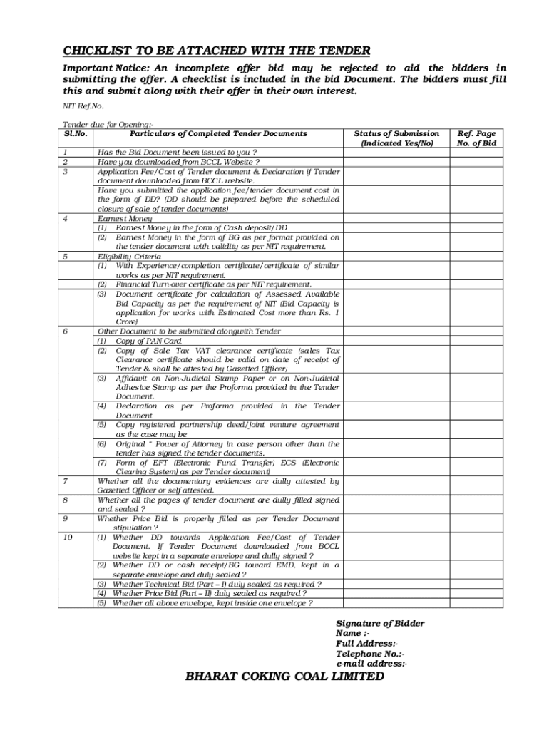 CHECKLIST TO BE ATTACHED WITH THE TENDER Important Notice: An incomplete offer bid may be rejected to aid the bidders in submitting the offer. A checklist is included in the bid Document. The bidders