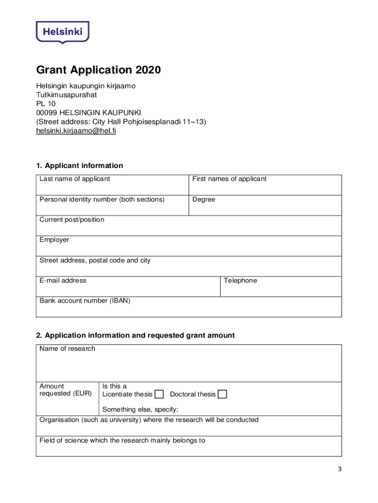 Dear applicant of the City of Helsinki Research Grants Please fill in the application carefully and follow the instructions. Incomplete applications will not be considered. The research grants are