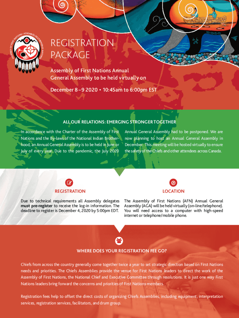 BLY OF FIR SEM ST AS N ASSEMBLED SIRES NATIONS EM PINS IO REGISTRATION PACKAGE Assembly of First Nations Annual General Assembly to be held virtually on December 8 9 2020 10:45am to 6:00pm STALL OUR