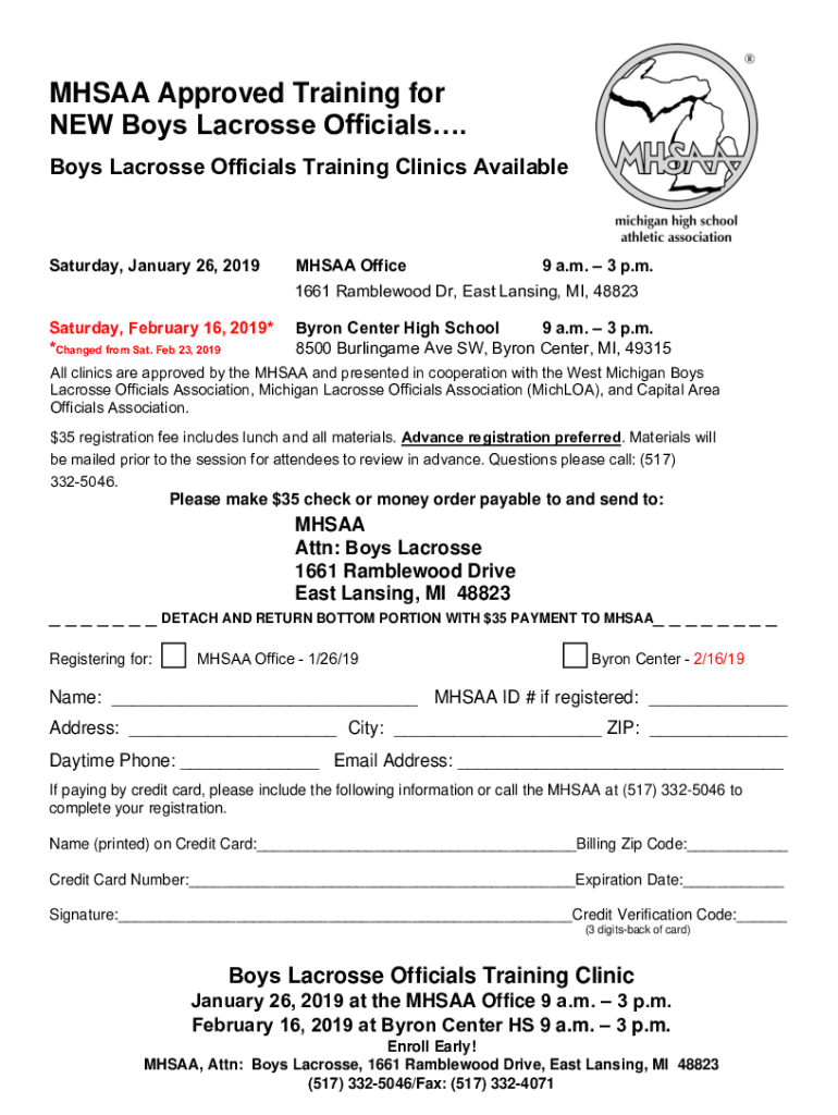 MH SAA Approved Training for NEW Boys Lacrosse Officials. Boys Lacrosse Officials Training Clinics Available Saturday, January 26, 2019MHSAA Office 9 a.m. 3 p.m. 1661 Ramble wood Dr, East Lansing,