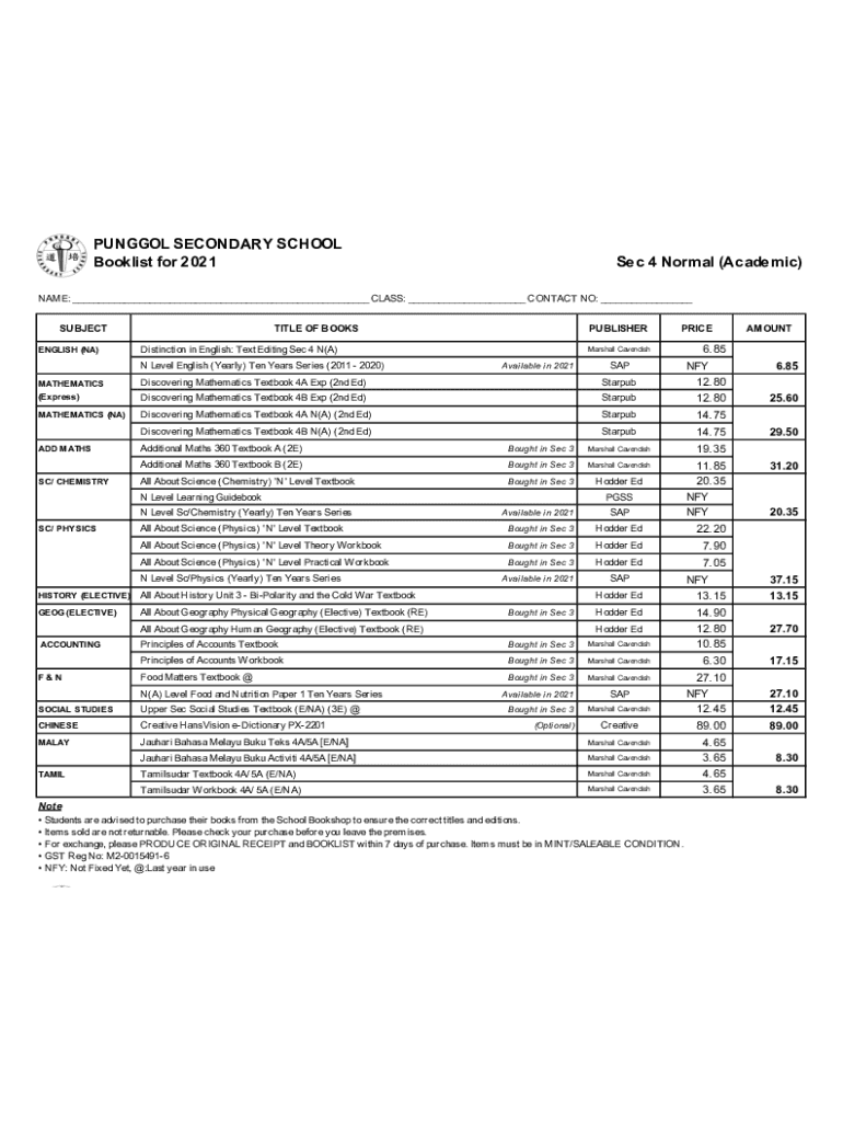 PUNGGOL SECONDARY SCHOOL Book list for 2021Sec 4 Normal (Academic)NAME: ___ CLASS: ___ CONTACT NO: ___ SUBJECT ENGLISH (NA)TITLE OF BOOKSPUBLISHERDistinction in English: Text Editing Sec 4 N(A) N