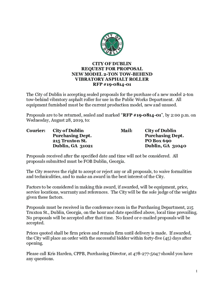 CITY OF DUBLIN REQUEST FOR PROPOSAL NEW MODEL 2TON BEHIND VIBRATORY ASPHALT ROLLER RFP #19081401 The City of Dublin is accepting sealed proposals for the purchase of a new model 2ton tow behind vibratory